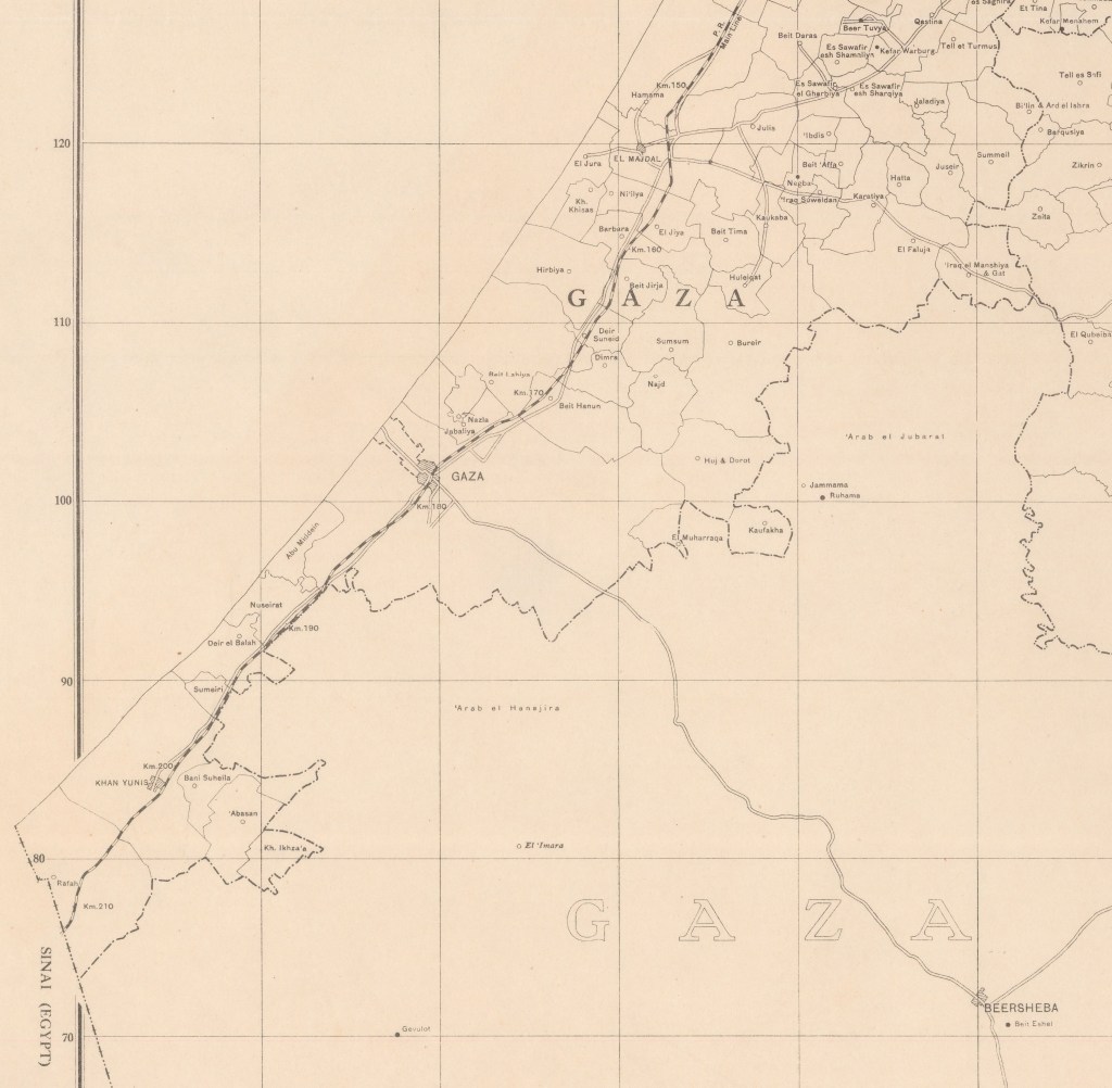 Because of this, colonial British maps of Palestine continue to look more relevant today than they otherwise would, given how much the landscape has changed since the British abandoned the region in 1948. You can see examples here, of village and/or municipal boundaries from a British map. Note Beit Hanoun, now in a Northern Gaza, which here appears halfway between the large font ‘Gaza’ near the top of the image and the smaller font ‘Gaza’ that indicates Gaza City:
