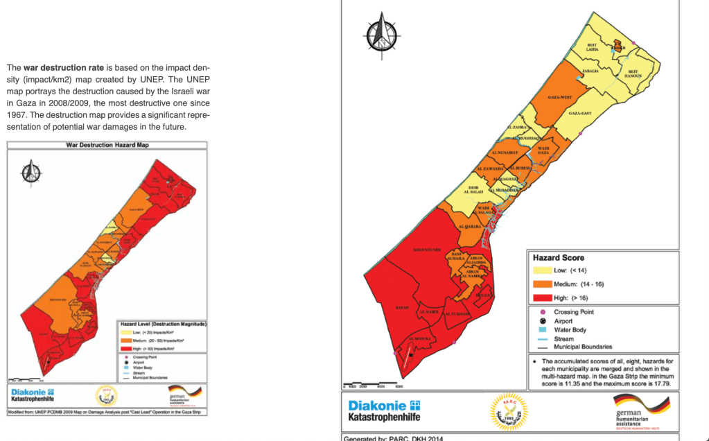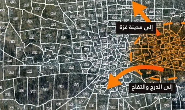 Comparing this image to the Israeli evacuation map, it’s possible to see that the Israeli map has no regular correspondence to boundaries that would be meaningful to people on the ground.