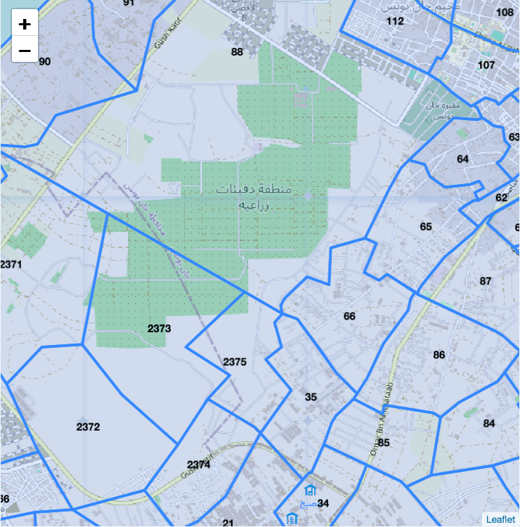 Look at area 2373, which cuts of 1/3 of an orchard, complexly cuts across the city boundary for Khan Younis, and contains no buildings. Similarly, 2372 and 2374 cut across streets, among them a curved road, in ways that would be nearly impossible to understand from a perspective on the gorund, and particularly in areas that have been devastated by bombing so that the division between street and building are no longer clear.