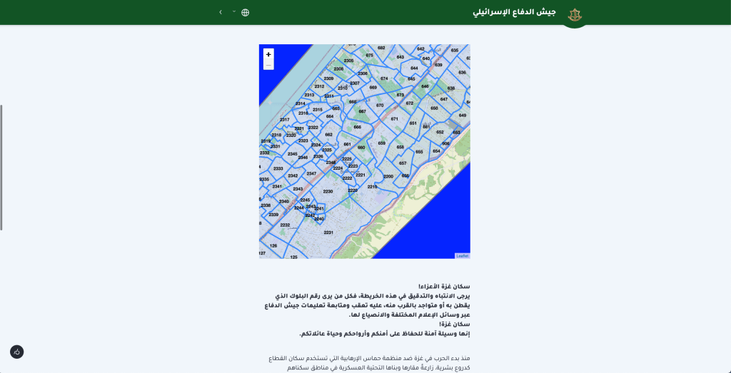 A quick post about the Israeli Defene Force (IDF)’s interactive evacuation map for Gaza. The map was posted online in early Dec. 2023 as the IDF’s horrific attacks on Palestinians in Gaza resumed after the end of the ceasefire.